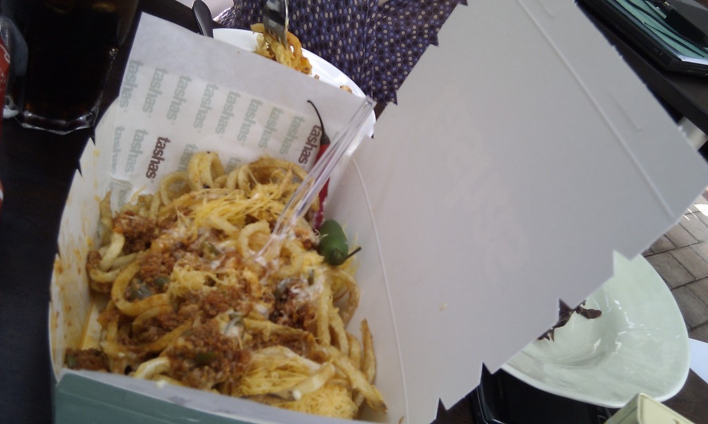 So we went to a little restaurant called Tasha’s with a colleague. The intention was to have their Belgian Chocolate Cake – more about that later. While looking through the menu, we opted for their Chilli Cheese Fries.